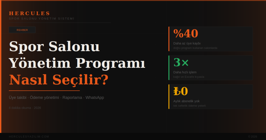 Bu kriterlerin hepsini karşılayan, Türk spor salonları için özel geliştirilmiş bir program arıyorsanız HERCULES‘e göz atabilirsiniz. Tek seferlik ödeme, sınırsız üye, internet gerektirmez.
